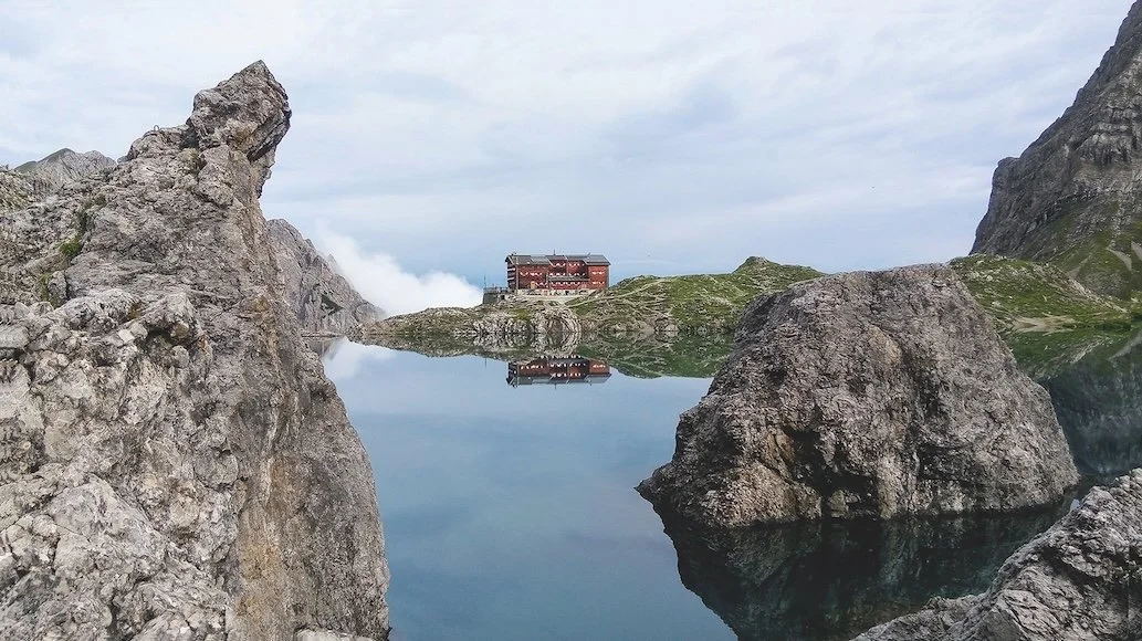 Eine anziehende Hürde, die zu überwinden unsere heutige Aufgabe sein soll. Der Himmel schüttelt die Schwärze der Nacht ab, den Horizont überzieht ein milchig gelber Schimmer. Bald wird sich die Sonne über die Berggipfel kämpfen und die vom nächtlichen Regen feuchten Felswände trockenlegen. Wir blicken zurück zu unserem Startpunkt: Der Karlsbader Hütte, die als Stützpunkt für Wanderer, Bergsteiger:innen und Kletterer idyllisch inmitten der Lienzer Dolomiten thront. Beinahe unwirklich scharf zeichnet sich ihr Spiegelbild im glasklaren Wasser des Laserzsees ab. Die Schönheit dieses Fleckchens Erde zieht mittlerweile auch Tourist:innen und Influencer:innen an, die am Ufer des Bergsees instagramtaugliche Foto-Kompositionen kreieren. Sie liegen jetzt noch in ihren Betten, während in den Klettergärten rund um die Hütte bereits der Wettlauf um die besten Übungsrouten beginnt.
